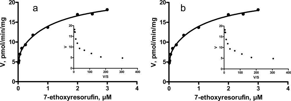 Eadie-Hofstee plots of EROD activities in porcine liver microsomes revealed a biphasic response, indicating that multiple enzymes are responsible for the biotransformation of 7-ethoxyresorufin to resorufin (Figure 2). It has been shown in various studies that EROD activities can be related to both CYP1A1 and CYP1A2 isoenzymes. Messina et al. [] demonstrated that CYP1A2 purified from β-naphthoflavone treated pigs was catalytically active toward 7-ethoxyresorufin and 7-methoxyresorufin. In rat, mouse and penguin liver microsomes, EROD activities followed a biphasic kinetic pattern [, ]. In contrary, a single enzyme was responsible for EROD in human, monkey and bovine liver microsomes [, ].