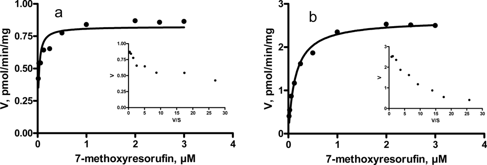Saturation curve for 7-methoxyresorufin O-demethylation by hepatic microsomes from entire (a) and castrated (b) male pigs. Insets: Eadie-Hofstee transformations of the same data. V – velocity of resorufin formation; S - substrate.