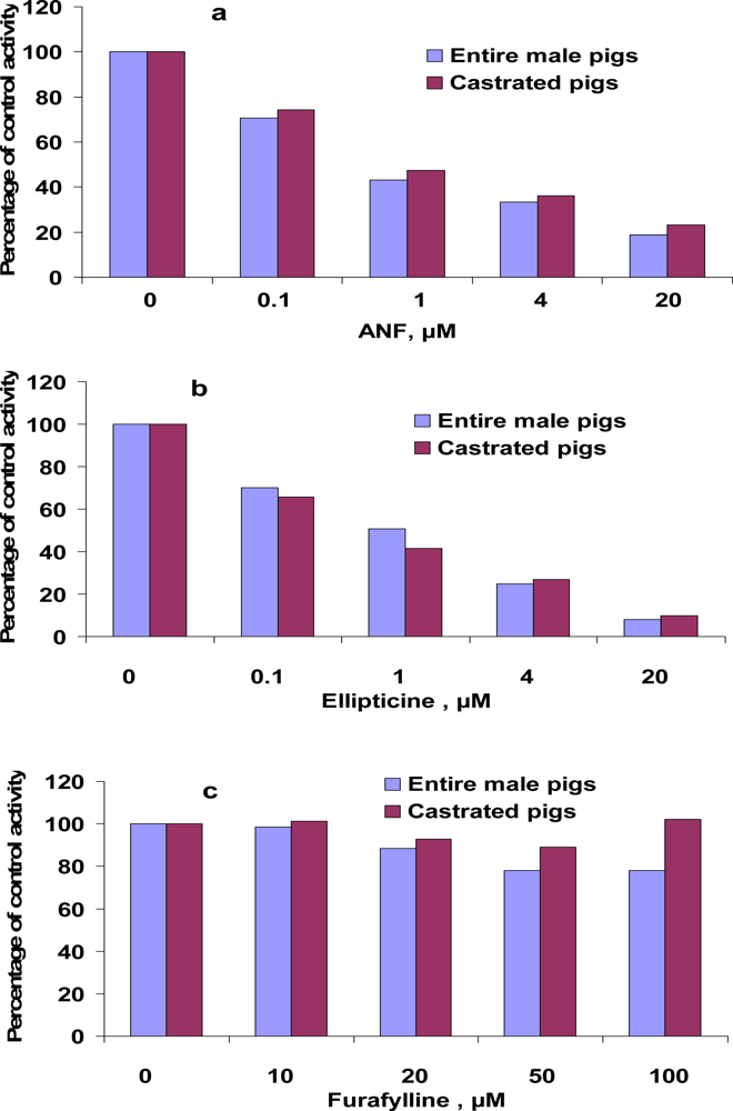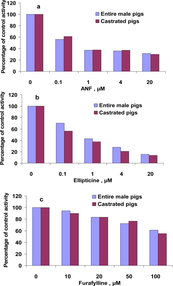Inhibition of 7-ethoxyresorufin O-deethylation (EROD) in hepatic microsomes from castrated and entire male pigs by ANF (a), ellipticine (b) and furafylline (c). Assays were performed as described in the Experimental section. Values are expressed as percentages of activities in control incubations and are the mean of duplicates (differences between the duplicates were below 10%).