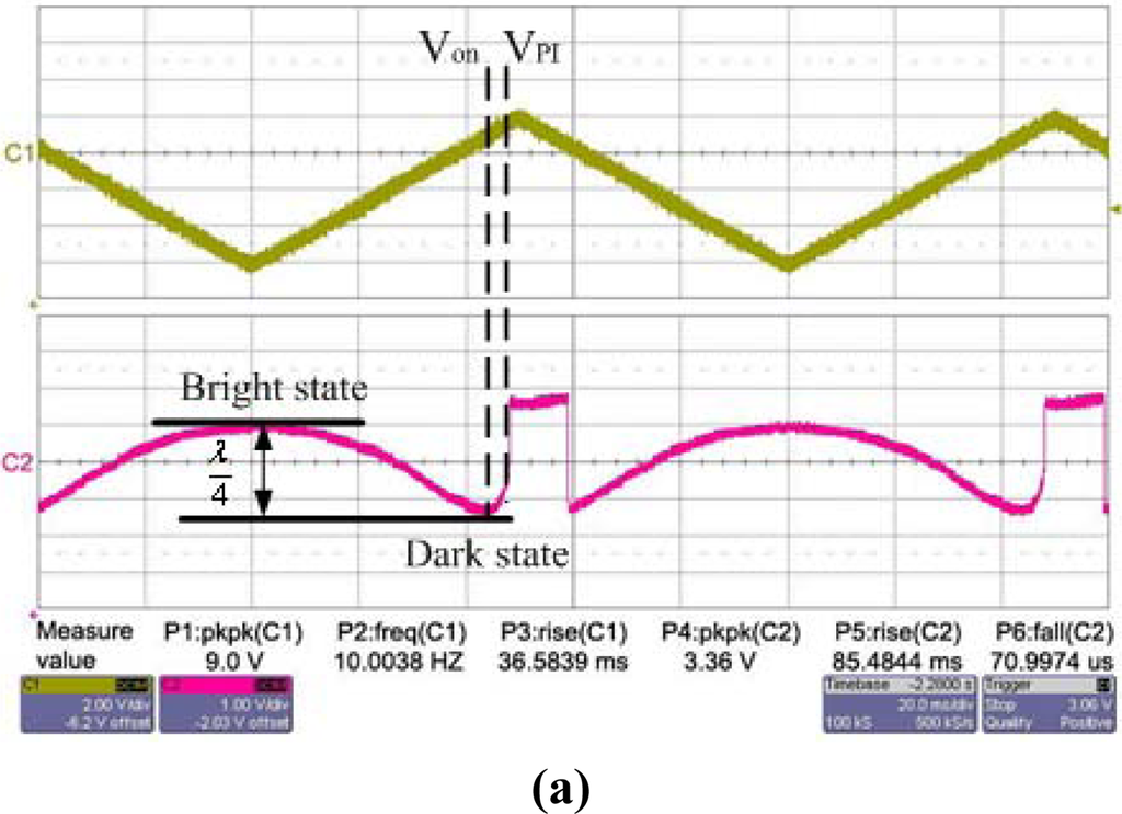 In Figure 11, the upper curve “C1” is the driving voltage of the GLM, and the bottom curve “C2” is the ±1st order intensity response of the GLM. Figure 11a shows that the GLM is actuated by a ramp-wave voltage. The ±1st order initial phase difference of the fabricated GLM is (2n'+1)π. According to the operating principle of the GLM, when no voltage is applied, the intensity of the ±1st order diffraction light is the bright state, and a high voltage signal is read out on the oscilloscope. When the ramp-wave voltage increases slowly, the movable grating moves down slowly, the intensity of the ±1st order diffraction light will decrease, and the voltage signal of the ±1st order diffraction light on the oscilloscope reduces. When the movable grating moves down a λ/4 distance, the phase difference become 2n'π, and the light intensity is in a minimum which is the dark state. As a result of the phase’s period, the ramp-wave voltage continues to increase, the light intensity increases, but as the movable grating pulls in, the light intensity jumps to a maximum. Figure 11a shows that the operating voltage Von of the GLM is 7.8 V and the pull-in voltage VPI of the GLM is 8.5 V, which are very close to the theoretical values. The difference between the theoretical value and the experimental value results from the slight difference between the designed structure and the fabricated structure.