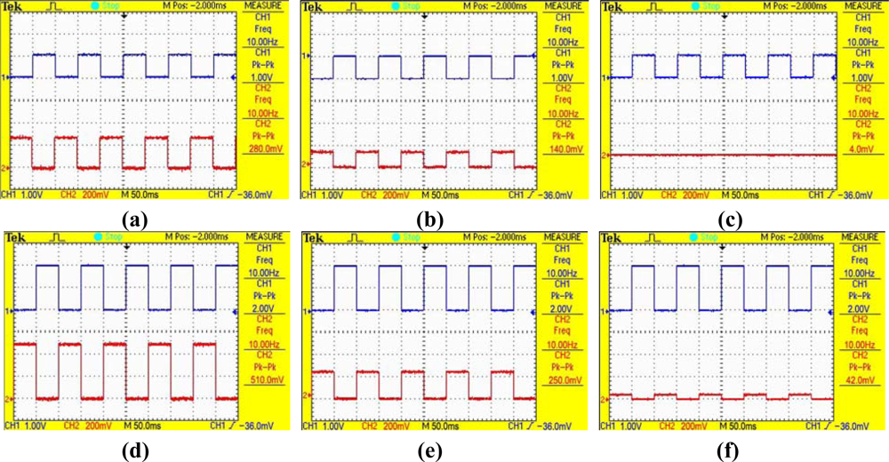 In Figure 12, the upper curve “1” is the square-wave voltage of the all-selected pixel, and the bottom curve “2” is the ±1st order diffraction light intensity of the different pixels. As the fabrication processes of all pixels in array are the same, the pixels with the same peak-to-peak value of the diffraction light intensity have the same actuated voltage in the same scope of the phase difference. By comparing Figure 12a with Figure 12e, the peak-to-peak value of the light intensity is 280 mV when the square-wave voltage of the all-selected pixel is 1V, which is very approximate to 250 mV when the square-wave voltage of the all-selected pixel is 2 V. It can be concluded that the square-wave voltage of the half-selected pixel in Figure 12e is about 1V, which is consistent to the theory that the voltage of the half-selected pixel is half of the all-selected pixel in the 16×16 GLM array. The results also show that when an all-selected pixel is actuated by a voltage, the voltage of the half-selected pixel is much larger than the voltage of the non-selected pixel, but it is smaller the voltage of the all-selected pixel, which agrees with the crosstalk theory of the matrix capacitance.