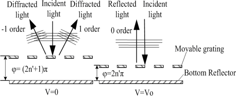 Both the movable grating and the bottom reflector are made of aluminum, and they are separated by an insulating layer and an air gap. The movable grating and the bottom reflector form a phase grating, and the phase difference is determined by the space between the movable grating and the bottom reflector.