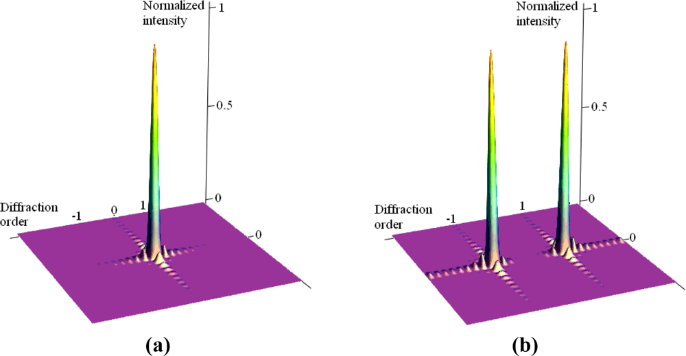 The diffraction intensity distribution of the GLM. (a) The phase difference is 2n'π. (b) The phase difference is (2n'+1)π.