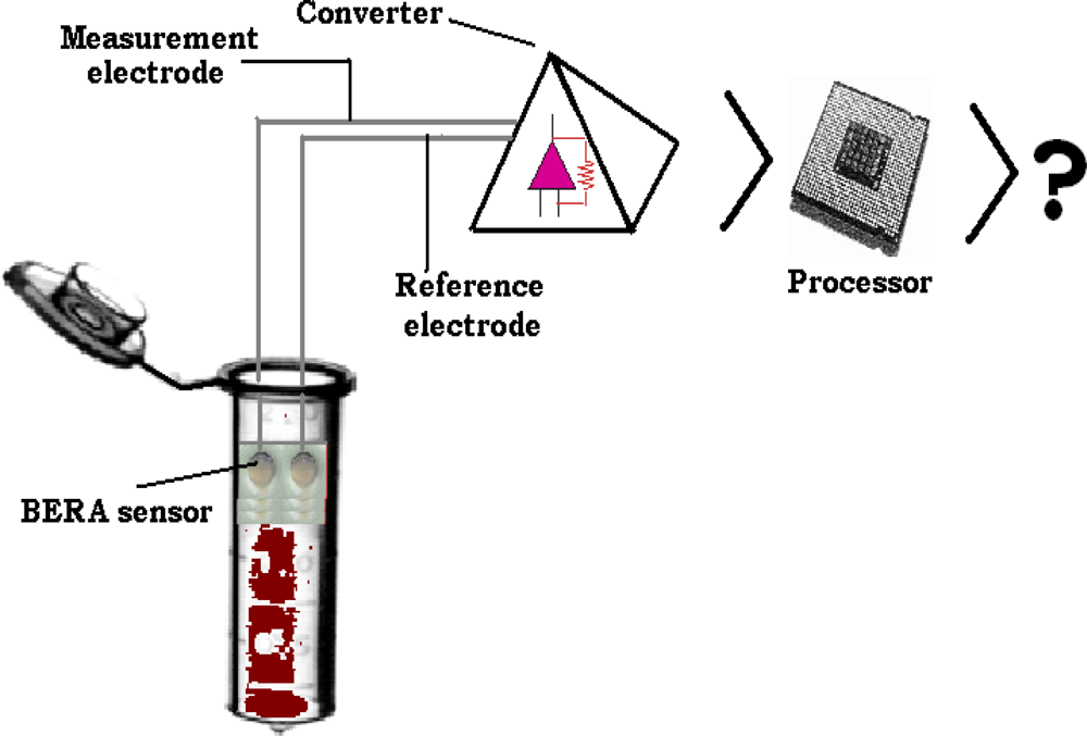 Schematic representation of the immobilized cell biosensor. The reference electrode is manually inserted in a cell-free gel bead, while the measuring electrode is inserted in the immobilized cell-loaded gel bead. Neither electrode is in direct contact with the sample solution (i.e. only beads are immersed into sample). The approximate diameter of the beads is two mm. Both measurement and reference electrodes are connected to the PMD 1608-FS converter.
