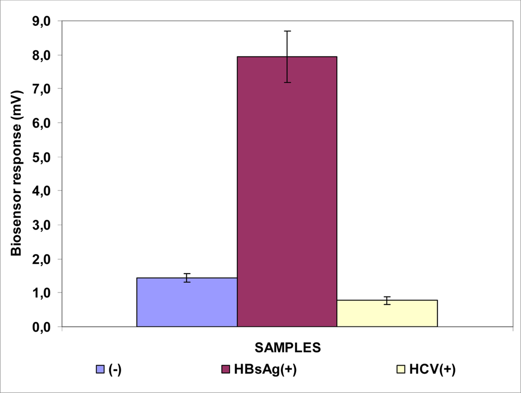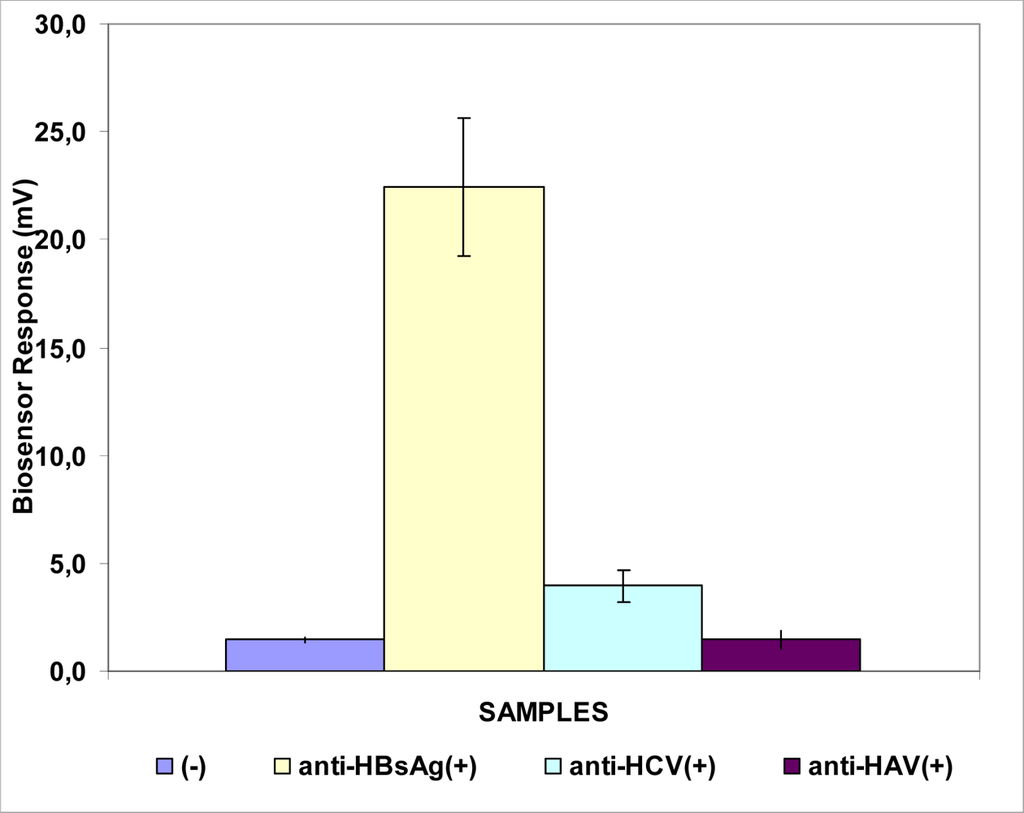 Detection of anti-HBs antibodies in clinical samples was made possible by using a biosensor based on immobilized Vero cells bearing the respective antigen (HBsAg) (Sensor C). A very high response of the sensor to samples positive for anti-HBs (23 ± 4 mV) was observed compared to samples containing antibodies of the heterologous viruses (anti-HAV, anti-HCV) or negative samples (Figure 4).