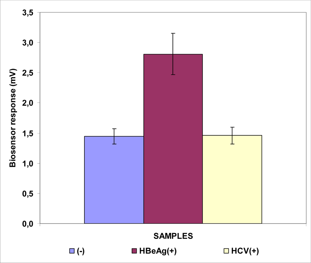 A similar result, but with a considerably lower intensity of response (3.5 ± 0.6 mV, Figure 3) to samples positive for the HBeAg was obtained with the biosensor based on Vero cells bearing the anti-HBe antibody (Sensor B). As in the case of HBsAg detection, the response was considerably higher compared to samples containing heterologous hepatitis viral antigens (HCV) or negative samples.