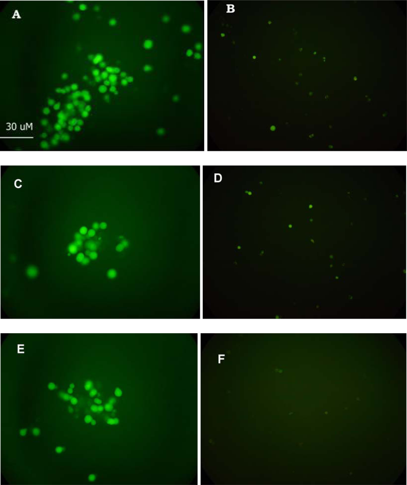 Changes (expressed as differences in fluorescence intensity) of the cytoplasmic calcium ion concentration in Vero cells, membrane-engineered with anti-HBs (A, B), anti-HBe (C, D) and HBsAg (E, F), before (A, C, E) and after (B, D, F) treatment with the HBsAg, HBeAg and anti-HBs respectively.