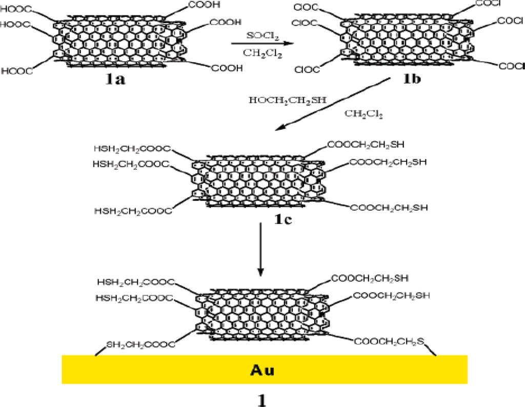 Scheme for the preparation of MWCNTs chemically modified electrode bearing SH groups. Reprinted with permission from [44]. Copyright (2006) American Chemical Society.