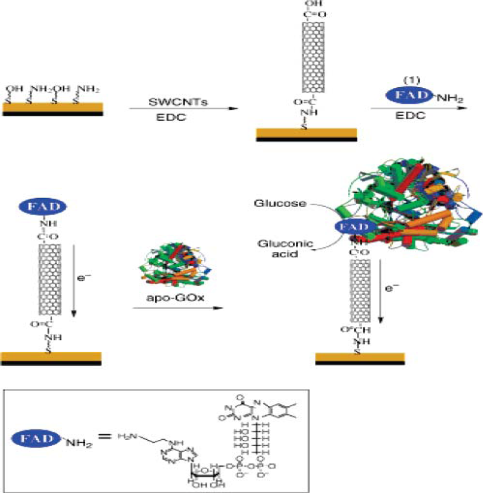 Assembly of the CNT electrically contacted glucose oxidase electrode. Reprinted with permission from [82]. Copyright (2008) American Chemical Society.