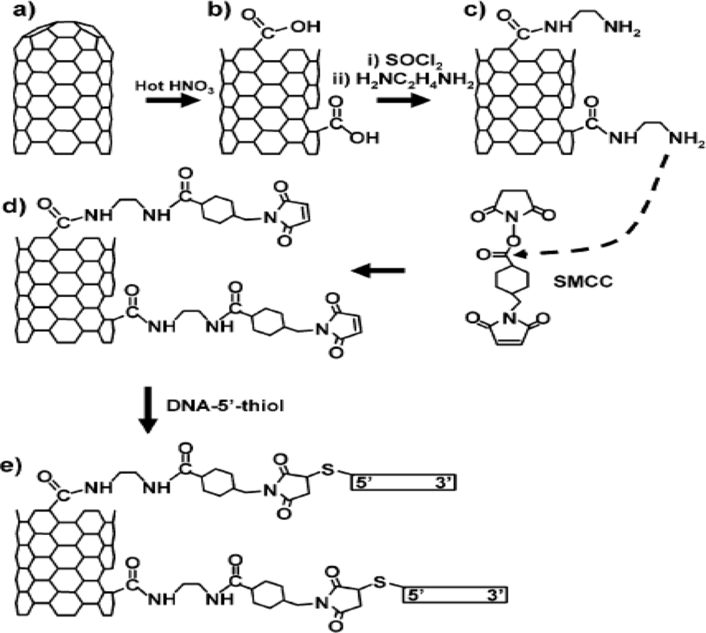 Overall scheme for fabrication of covalently linked DNA-nanotube adducts. Reprinted with permission from [134]. Copyright (2002) American Chemical Society.