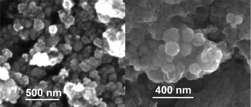 SEM image of Fe2O3 (left) and GdIII/SiO2 (right).