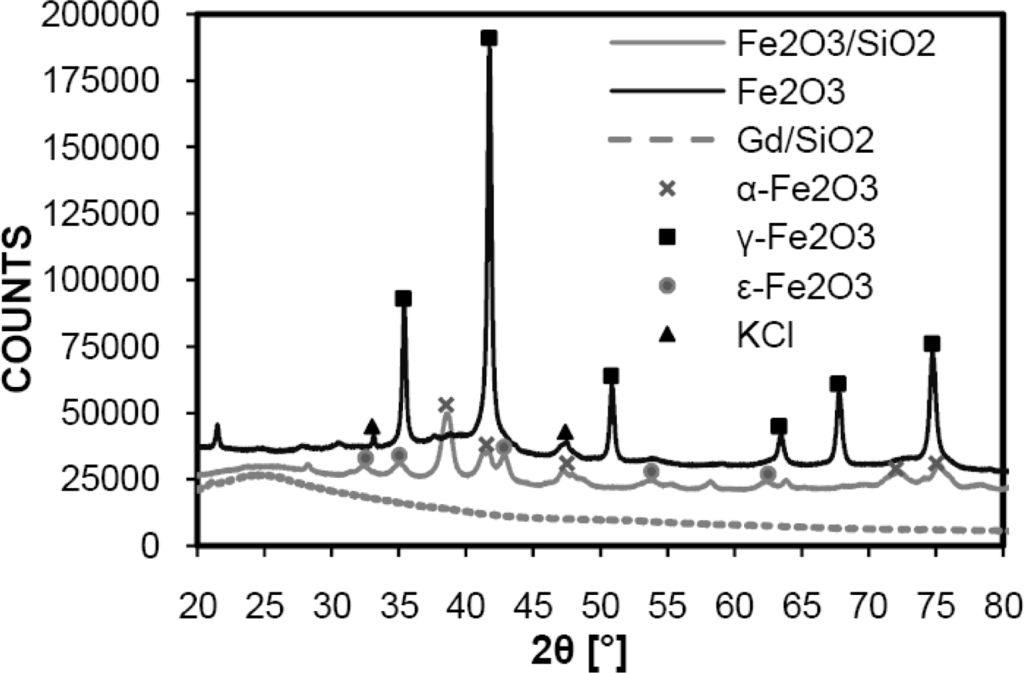 According to XRD measurement (XRD patterns of all samples are shown in Figure 3.), GdIII/SiO2 nanoparticles were found to be completely amorphous. The orthorhombic ε-Fe2O3 was observed as majority phase (49 %) together with hematite (24 %) in the case of Fe2O3/SiO2 annealed at 800 °C for 4 hours, which is different from the results reported by Ichiyanagi et al. [25]. The ε-Fe2O3 phase is considered to be an intermediate between maghemite and hematite and it is magnetically very interesting for its high coercive force [26]. The value of mean coherence length corresponding to crystallite size estimated using Rietveld analysis was about 14 nm for both α- and ε-Fe2O3 phases. It can be assumed that there are also very small maghemite or magnetite particles but these were not detected in XRD spectra probably due to “hiding” of their peaks in the amorphous one belonging to SiO2 (27 %).