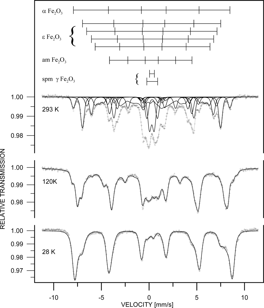 The phase analysis carried out from the Mössbauer spectrum (Figure 4) confirmed ε-Fe2O3 as the dominating iron containing phase (51 %) represented by four sextets with following parameters (see Table 1.). The ε-Fe2O3 phase was completed by hematite (8 %), superparamagnetic maghemite (19 %, represented by two doublets) and amorphous phase (22 %, represented by a broad sextet).