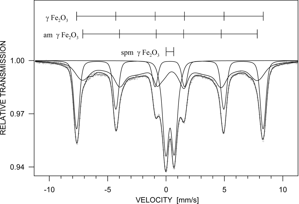The superparamagnetic behaviour of the maghemite is documented by the measurement of the Mössbauer spectra at various temperatures (shown in Figure 4.). The doublets ascribed to the maghemite splitted continuously to sextets when the sample temperature decreased below the blocking temperature. The broad interval of the blocking temperature indicates broad size distribution of the maghemite nanoparticles. The amorphous phase represents probably surfaces, interfacial regions, fine particles slightly below blocking temperature and particles with perturbed oxygen stoichiometry of the magnetic phases mentioned above. Generally, all values of relative intensities and hyperfine parameters agree with the data reported in literature, e.g. [10,27,28].