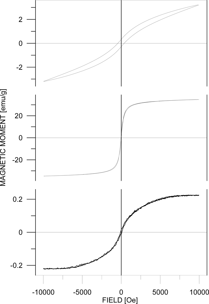 Magnetization curves of Fe2O3/SiO2 (top), Fe2O3 (center) and GdIII/SiO2 (bottom).