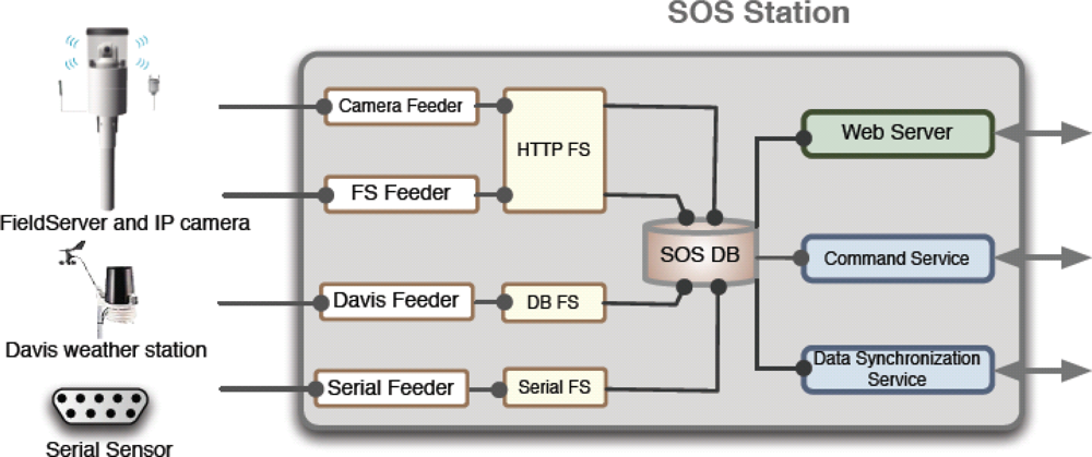 The SOS Station is capable of controlling more than one fieldserver and their cameras. It also has the capability to collect data from several types of weather stations and data loggers from RS232 serial ports. As shown in Figure 3, feeder systems have been developed separately for the aforementioned devices. The feeder templates are open, supporting an open system and easy installation; any device manufacturer can utilize these templates. The webserver implemented on the SOS Station gives access to all sensor data as well as device and sensor configuration.