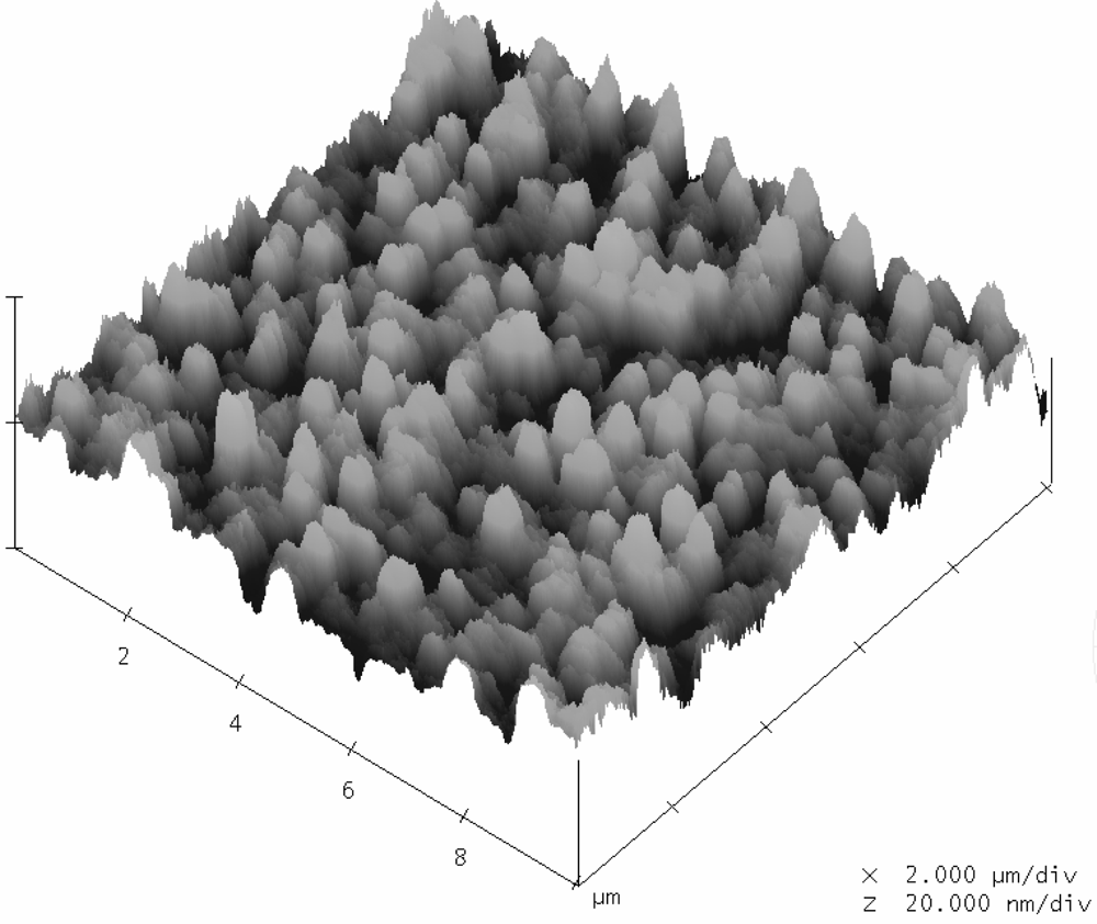 To examine the surface morphology of ruthenium nitride, a scanning electron microscope (SEM) and a scanning probe microscope (SPM) were used. A Philips XL-40FEG field emission scanning electron microscope was used to reveal the cross-section and nanometric structures of the ruthenium nitride thin film and a tapping mode atomic force microscope (Digital Instrument NS3a controller with D3100 stage) was used to measure the surface morphology of ruthenium nitride thin film.