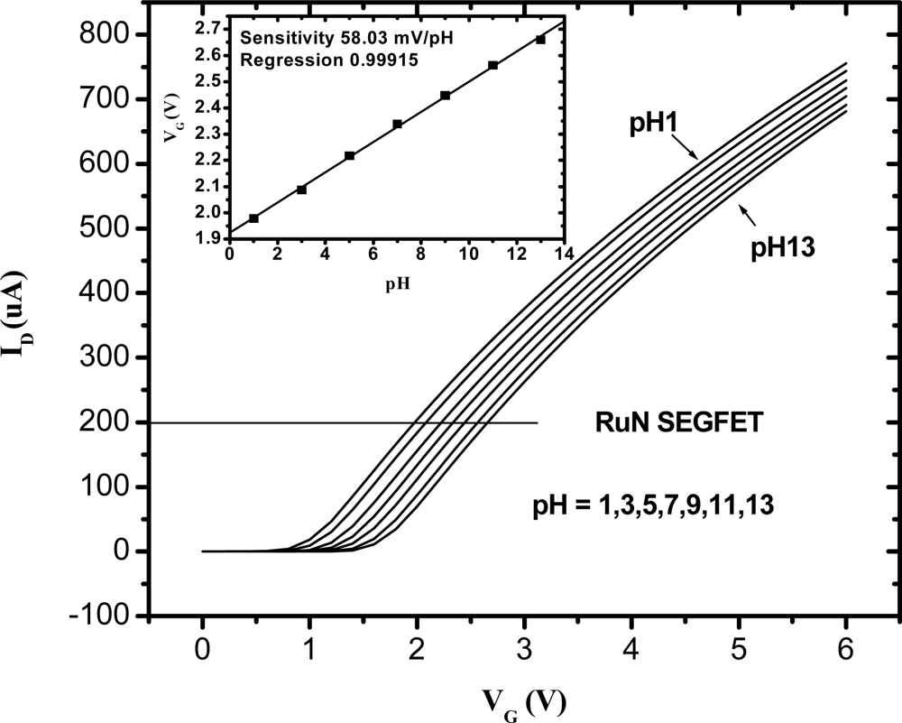A Keithley 236 semiconductor parameter analyzer was utilized to measure the current-voltage characteristics of the RuN thin film pH-sensitive SEGFET in pH = 1, 3, 5, 7, 9, 11 and 13 standard buffer solutions. The current voltage (I–V) measurement system is shown in Figure. 1. The gate of MOSFET is connected to the RuN pH sensor. The drain and source of MOSFET are connected to the current measuring unit of the Keithley 236. The RuN sensing membrane pH sensor device and an Ag/AgCl reference electrode were immersed into the different standard buffer solutions, respectively and placed inside a dark box to eliminate any light-induced effects. The commercial Ag/AgCl reference electrode provided a constant potential during the whole measurement process. The drain-source voltage (VDS) was maintained constant at 0.2 V and the VG voltage was increased from 0 to 6 V while the drain-source current (IDS) was measured. The sensitivity of RuN sensing membrane pH sensor was obtained from the ID-VG curves.