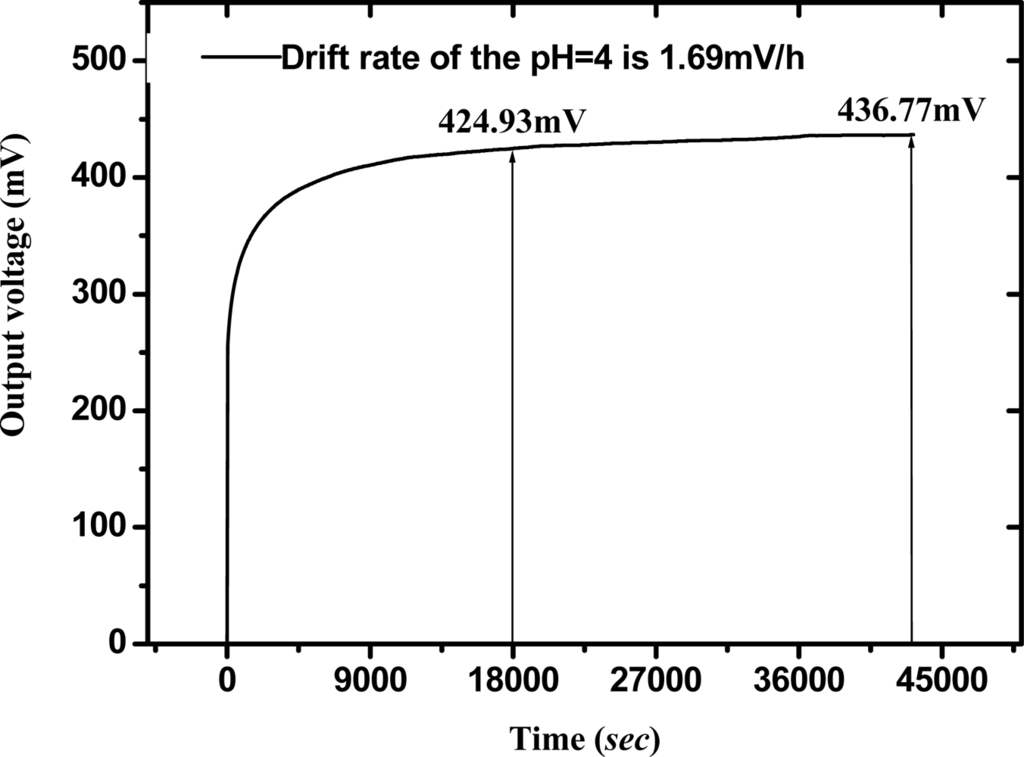 The drift phenomenon in pH electrochemical sensors with various sensing materials, such as a-Si:H, Si3N4, Al2O3, Ta2O5, AlN and SnO2 has been discussed [, , , , , ]. According to Zhong et al. [] the surface voltage response reaches a steady state after five hours with no pH variation. Therefore, we choose the measured data as representing a long term drift rate during 5–12 hours. The drift phenomenon shows that the output voltage of the RuN sensor device varies slowly with time. Drift behavior existed in the whole measurement process and could be characterized as a function of pH value. The V-T measurement system was used to measure the drift rate of the RuN sensing membrane pH sensor in pH1, 4, 7, 10, 13 standard buffer solutions. Figure 7 shows the drift rate of RuN pH sensor in pH4 buffer solution after measuring for 12 hours. The calculation of drift rate is 1.69 mV/h, which is the voltage difference from 18,000 sec (5 hours) to 43,200 sec (12 hours), divided by the time duration (7 hours). According to the experimental results, we can obtain the drift rate with percent error of the RuN sensing membrane pH sensor, which are shown in Table 3. It is obvious that the higher the hydrogen ion concentration, the lower the drift rate was. The cause is that at lower H+ concentrations, the higher pH value, and the ion size of H+ is smaller than OH−. Therefore, the drift speed of H+ is quicker than for OH−. The drift rates were compared with other nitrides and different thin films as shown in Table 1.