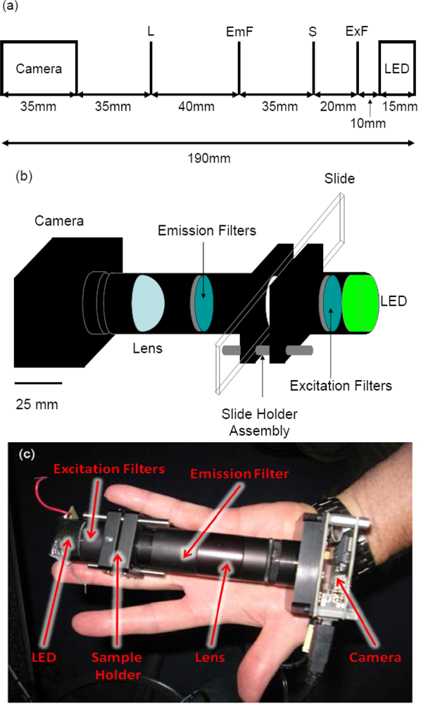 Diagrams and picture of the actual device. All measurements are in millimeters (a) Optical layout of the device. L = lens with a 25.4 mm focal distance, EmF = emission filters, S = sample, ExF = Excitation filters. (b) Schematic of hand-held microarray reader. (c) Actual image of the hand-held reader.