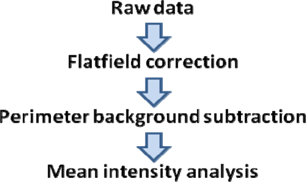 Computer-based algorithms were implemented to turn the imaging system into a reader, shown as a flowchart in Figure 2. The first process corrected for uneven light distribution from the LED. This simple step was applied to each image and verified by comparing two images recorded at different angles. Next, mean intensities of the spots and their perimeters were gathered, and background subtraction using this information was performed. These steps yielded the corrected mean spot intensities used for analysis, which were found to be comparable to the values obtained from a commercial laser scanner. These processes are described in detail in the Experimental section.