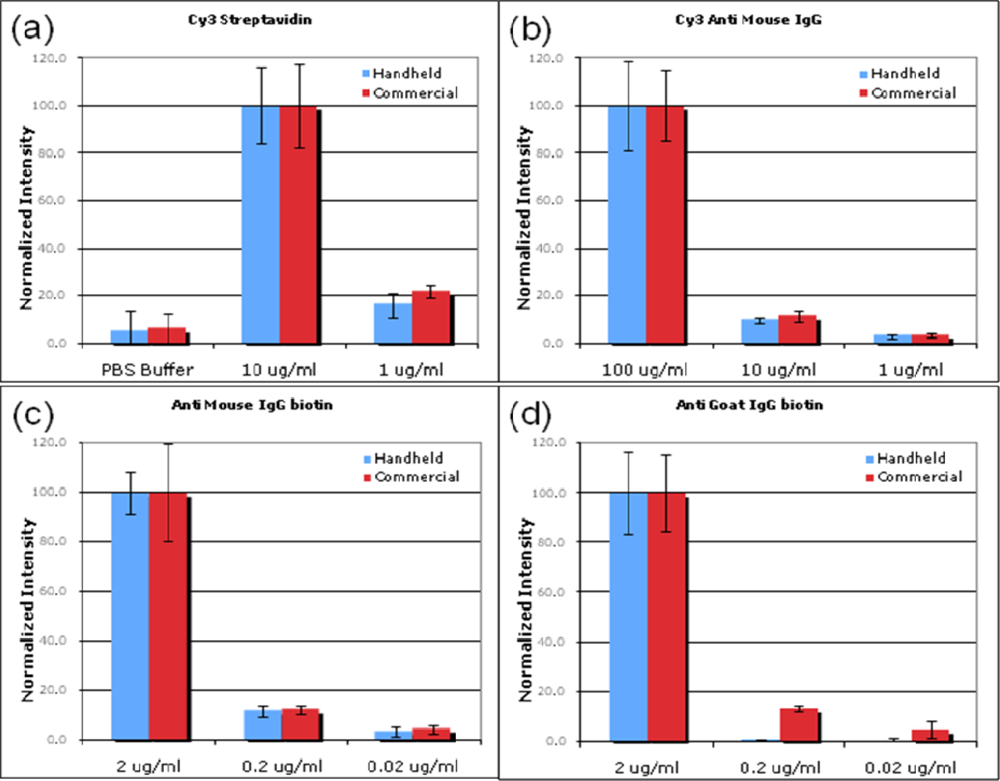 Comparative analysis of the handheld reader’s results with those of a traditional scanner. Each graph was normalized so the brightest spots each had intensity values of 100. Error bars represent a total of two SDs for each spotting group. (a) Intensities of the PBS spots and the 10 : 1 printing ratio of Cy3 streptavidin are plotted. (b,c) The 100 : 10 : 1 printing ratios are reflected in the fluorescence intensity ratios for both of these spotting groups. (d) The handheld scanner reaches its detection limit for the concentrations shown of anti goat IgG biotin where the SD is larger than the mean intensity value.