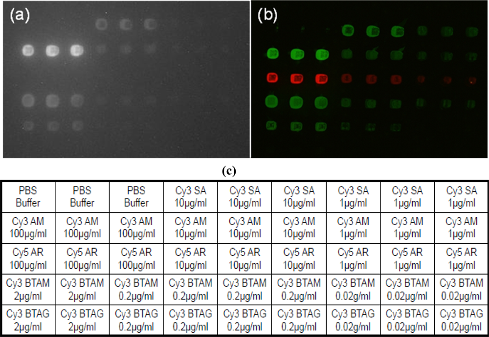 Reagents were spotted at concentrations shown in Figure 4. PBS was printed as a negative control. One labeled peptide and four different antibodies were printed as positive controls: Cy3 streptavidin (Cy3 SA), Cy3 anti mouse IgG (Cy3 AM), anti mouse IgG biotin (BTAM), anti goat IgG biotin (BTAG) (Rockland Immunochemicals, Inc. Gilbertsville, PA, USA), and Cy5 anti rabbit IgG (Cy5 AR) (Zymed Invitrogen, Carlsbad, CA, USA). The antibodies were diluted in 2x Protein Arraying Buffer (Schleicher & Schuell, Whatman, Kent, UK) to a total volume of 15 μL in a 96-well titer plate. Approximately 10 nL of each solution was printed on Corning GAPS II Slides (Invitrogen, Carlsbad, CA, USA) using the OmniGrid Accent (Genomic Solutions, Ann Arbor, MI, USA) arrayer. Slides were crosslinked for 5 mins using UV irradiation. Four subarrays were printed on each slide, and the spacing was 250 μm spot-to-spot both horizontally and vertically within each subarray. The array layout can be seen in Figure 4c. Prior to use, the slides were blocked for 1 hour using PBS containing 1 mg/mL of BSA. The slides were then washed three times in 1X PBS containing Tween® 20. For detection, a total of 800 μL of Cy3 SA in PBS was added to the array. The Cy3 SA interacts with the biotin to allow detection. After a 10 minute incubation period, slides were again washed three times for five minutes in 1X PBS before air drying.
