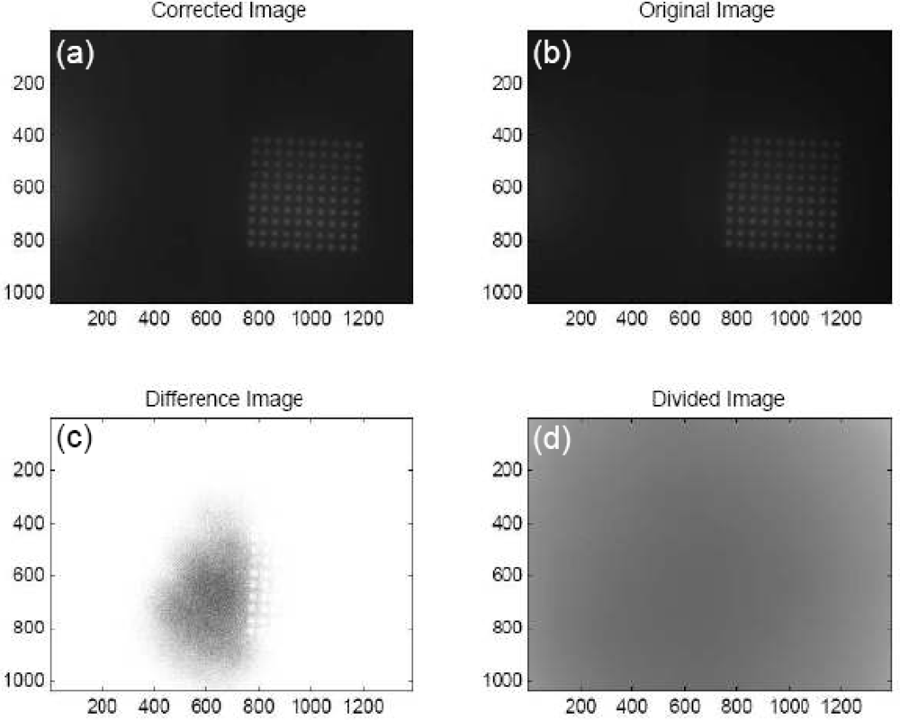Results of the flatfield correction program. (a) The image as it appears after being corrected. (b) The original image. (c) The adjusted image subtracted from the original image. (d) The adjusted image divided by the original image.