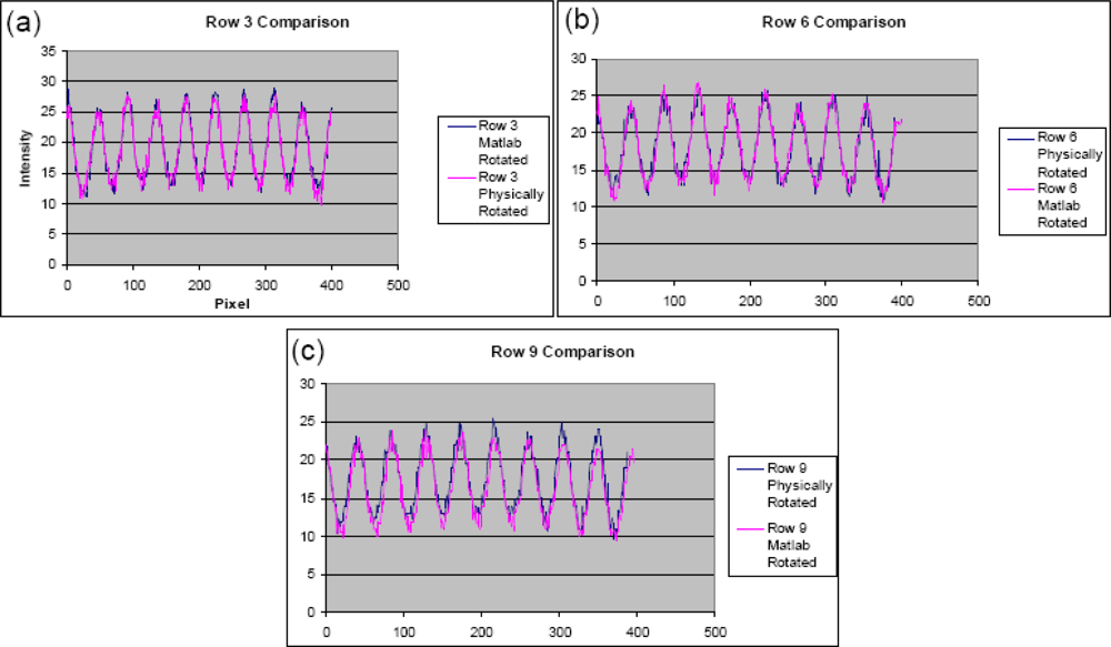 The comparison between the physically rotated and the computer rotated images showed the peaks in each row matching in both height and position. Some discrepancy was noticed in the mean intensity between the two images, but the difference in each row was only 1 – 4%. This can be attributed to differences in ambient light during the experiment combined with human error in selecting the line to be evaluated using ImageJ. Changes in background counts were observed after the flatfield correction, but this was expected since the calibration takes into account the entire image, not just the array.