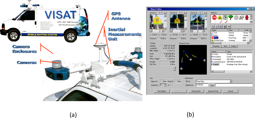 The development of land based MMS was initiated by two research groups in North America, The Center for Mapping at The Ohio State University, USA and the Department of Geomatics Engineering at The University of Calgary, Canada [1,5]. In the early 2000s, a number of land based systems have been applied in commercial applications [5–12]. There had been high expectations that these systems would have a large impact on conventional transportation surveying and mapping [1,2]. Figure 1a illustrates an example of a mobile mapping van and Figure 1b depicts an example of direct geo-referencing the traffic sign of interest from three geo-referenced images provided by a land based MMS. As shown in Figure 1a, the common feature of MMS is that more than one camera is mounted on a mobile platform, allowing for stereo imaging and 3-D measurements. Direct georeferencing of digital image sequences is accomplished through the use of navigation and positioning techniques. Various positioning sensors, GPS, IMU and dead-reckoning, can be combined for data processing to improve the accuracy and robustness of georeferencing. The ground control required for traditional mapping is thus eliminated. As shown in Figure 1b, the coordinates of the traffic sign can be determined directly through three geo-referenced images without any ground control and its attribute can be added to the spatial information database for future use.