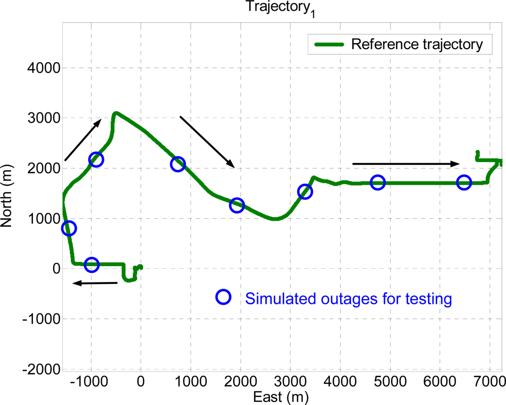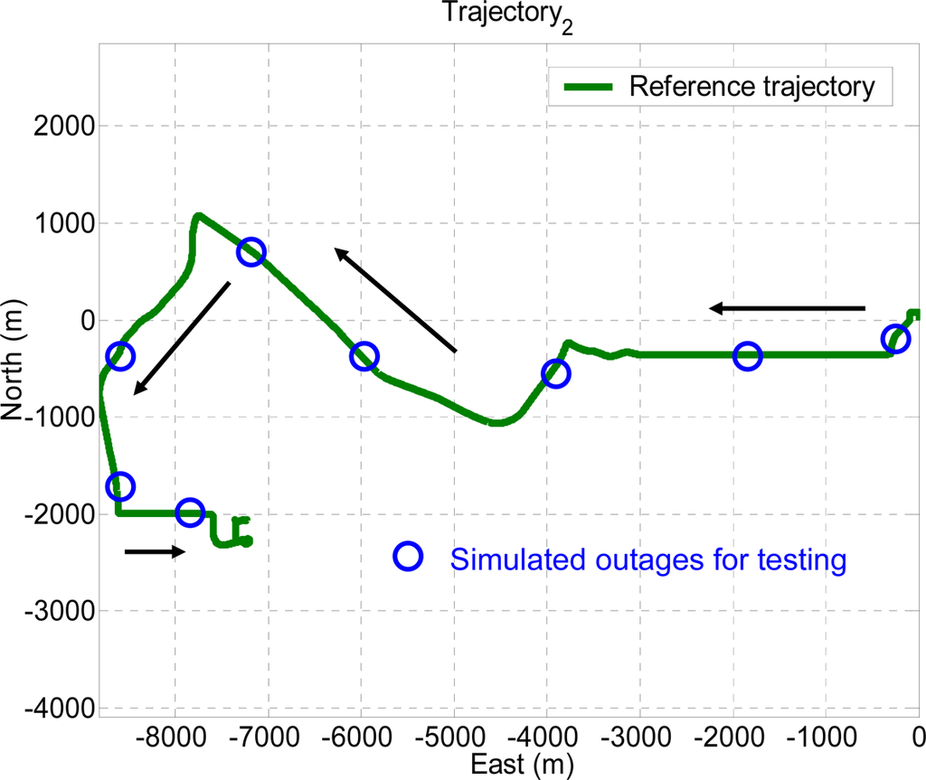 The GPS measurements were processed using GrafNav™ 7.0 software (Waypoint Consulting Inc.) in carrier phase DGPS to achieve ten centimeter level accuracy. The reference trajectories were generated by the integrated system with LN200 IMU. They were generated using 21 states EKF and RTS backward smoothing. The parameters of EKF and the smoother applied in this article were well tuned so that they can represent the best achievable navigation accuracy for tactical grade IMUs.