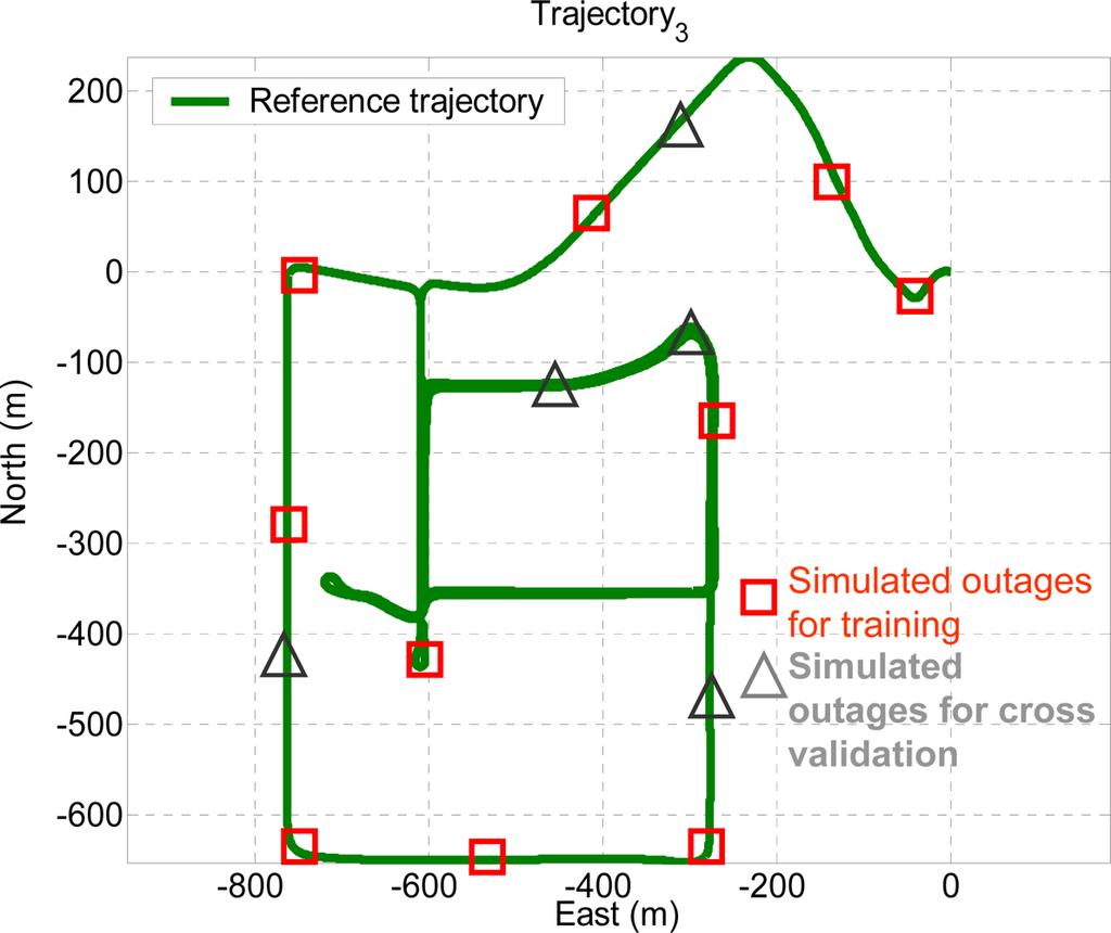 Ten GPS outages, marked in circles, each 60 seconds in length, were simulated using the measurements collected in the third field test, as indicated in Figure 13. Therefore, the outputs of KF and RTS smoother provided by those systems were applied as the inputs for the proposed architectures, as shown in Figure 8. In addition, the outputs of KF and RTS smoother with simulated outages were then compared with the reference trajectory. The errors, which can be interpreted as the error behavior of KF and RTS smoother, were then applied as the desired output for training. As shown in Figure 13, the dynamic variations experienced by the vehicle during the simulated outages include straight line segments, sharp turns, accelerations and decelerations. It is worth mentioning that five simulated outages, marked by triangles, were used as the independent dataset for cross validation during training process to ensure generalization capability as well as to avoid possible over-training problems.