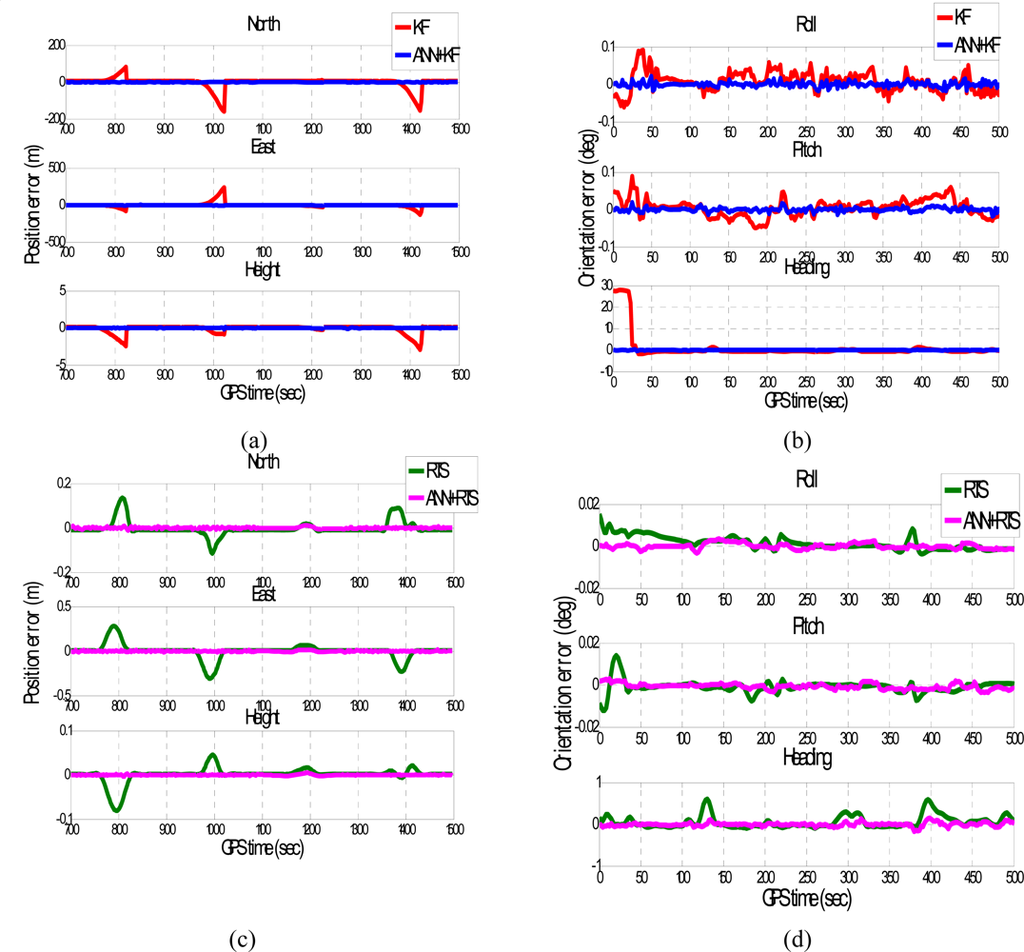 Table 3 shows the improvements produced by the proposed ANN-RTS smoother scheme. Comparing to the conventional EKF based scheme, the proposed ANN-RTS smoother scheme improves all the errors of roll angles, pitch angles, and heading angles estimated by EKF by 75%, 70%, and 75% on average, respectively. Similarly, the proposed ANN-RTS smoother scheme improves all the errors of orientation components estimated by ANN-KF by 75% on average comparing to the previously developed ANN-KF scheme. In addition, all of the improvements in positional POS parameters reach 80% on average. On the other hand, the proposed ANN-RTS smoother scheme improves all the errors of roll angles, pitch angles, and heading angles estimated by RTS smoother by 65%, 65% and 75% on average, respectively. In addition, all of the improvements in positional POS parameters reach 60% on average.