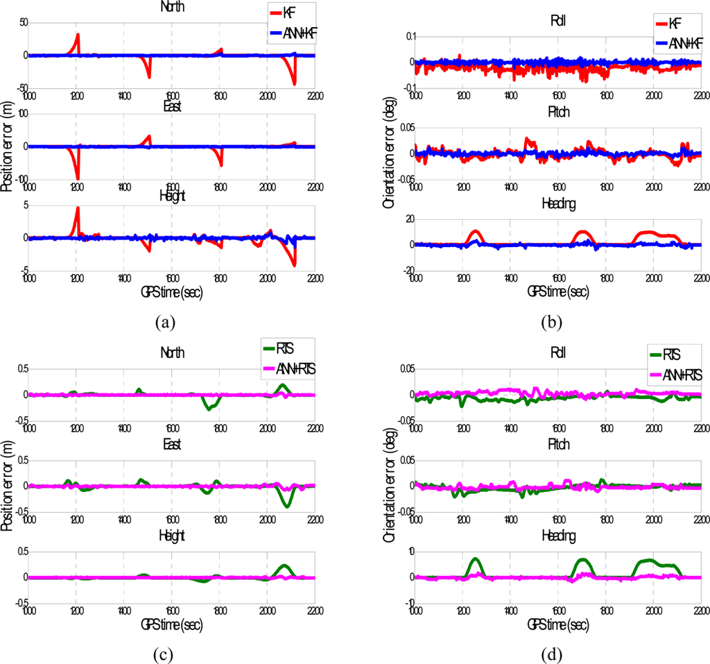 The proposed ANN-KF compensation scheme is able to improve the accuracies of positional components as well as orientation components in real time. After applying ANN-KF compensation, the orientations estimated by KF can be improved to the level of using RTS smoother in real time mode even with the use of a low cost MEMS IMU. In addition, the proposed ANN-KF scheme can accelerate the in-motion alignment process as well as improve its accuracy.