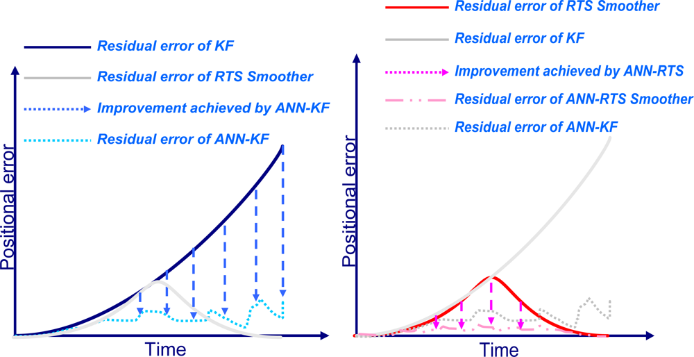 The RTS smoothed estimate at any epoch k is computed as a linear combination of the filtered estimate at that epoch and the smoothed estimate at the heading epoch k+1. Thus, the RTS smoothed estimate can be considered as updating the forward filtered solution to obtain improved estimates [3]. The computation of the smoothed estimate at each epoch requires the storage of the KF predicted and updated (filtered) estimates and their corresponding covariance at each epoch. This is the case in INS/DGPS integrated solutions when uninterrupted data streams are available. In case of DGPS outages, only predicted estimates and covariances are available. A conceptual plot of the impact of the RTS smoother on the positioning error in case of a GPS outage is given in Figure 4. As illustrated in this Figure, the use of a post-mission RTS smoother removes the residual errors of KF significantly; however, some residual errors still remain, so an ANN-RTS smoother scheme is used to reduce the residual errors of the RTS smoother by incorporating the benefits of artificial intelligence.