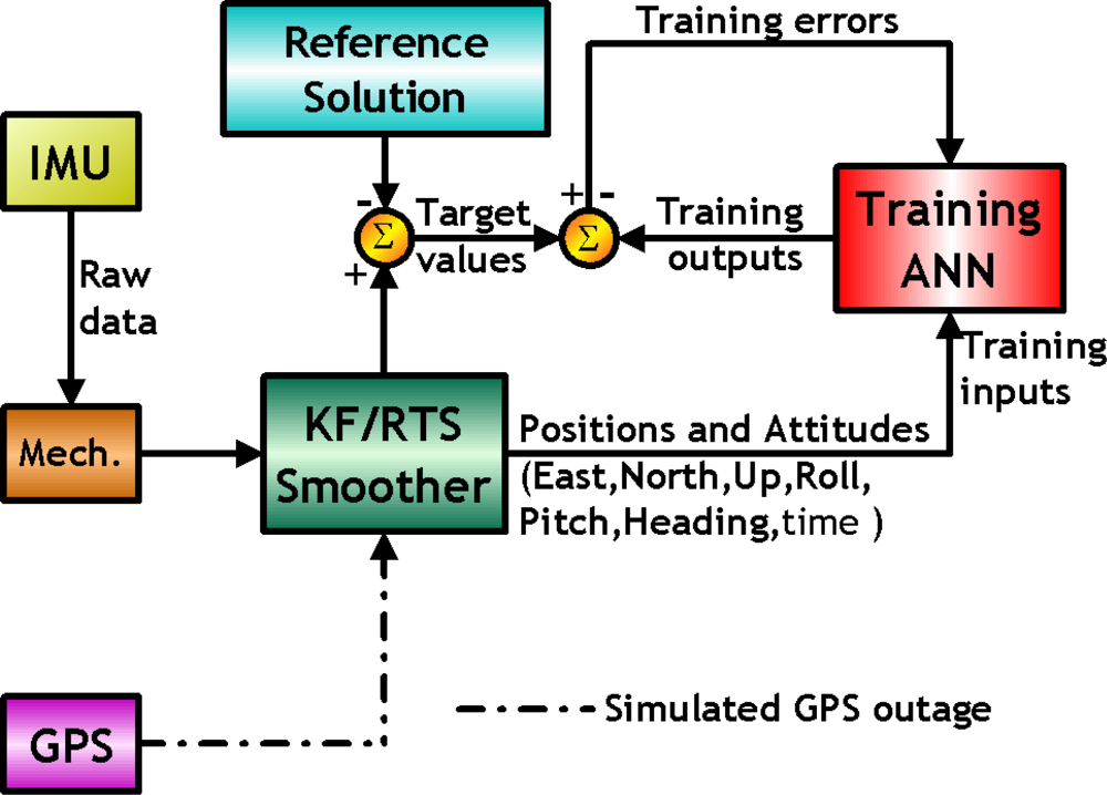 Consequently, high accuracy requirements for position and attitude determination in mobile mapping applications can be achieved in post-mission mode with an optimal smoothing algorithm. In fact, most of the commercial systems use an optimal smoothing algorithm to provide accurate position and orientation for direct geo-referencing [3]. As mentioned previously, an ANN-KF hybrid scheme has been proposed to improve the positional accuracy of vehicular navigation systems during GPS signal blockages [19]. In fact, all of the current commercially available INS/GPS integrated POSs use tactical grade or better IMUs to provide accurate POS solutions for general mobile mapping applications. Therefore, upgrading the hardware (e.g., IMU) can be considered an effective solution for improving the accuracy of POS solutions when a low cost MEMS IMU is used. However, such improvement is rather limited as the availability of high grade (navigation) IMUs is regulated by the governmental regulations of certain countries where the IMUs are produced.