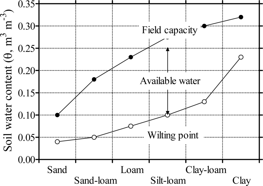 Conventionally, the water retention curve may allow computation of a few parameters that, along with porosity and bulk density, are used to describe the water relations of a given soil sample. Field capacity (θFC) is the water content in soil after it has been saturated (all pores are filled with water) and allowed to drain freely till the downward movement of water is terminated; wilting point (θWP) is the minimal moisture the plant requires not to wilt. The physical definition of θFC and θWP is the bulk θ at ψm of −33 or −1,500 kPa, respectively [12]. The limitation of these determinations is evident, since many factors, also related to the plant, affect the actual values of θFC and θWP. Nevertheless, these parameters serve as a practical measure of soil water holding capacity, also called available water. Soil available water is defined as the amount of water held between θFC and θWP. Figure 2 illustrates how θFC, θWP and available water changes as a function of soil texture. Readily available water is the fraction (generally, 50%) of available water that can be absorbed by the crop plant. The critical ψm at which many crops undergo water stress are in the order of magnitude of −100 kPa.