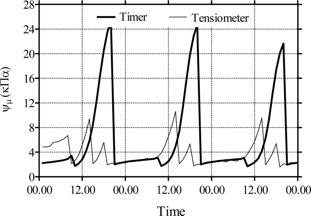 The θ or ψm ‘start’ value depends on crop species and developmental stage, soil characteristics and environmental conditions as well. For ψm, the typical range is between −20 and −70 kPa in soil (depending on soil texture) or between −4 and −10 kPa in soilless substrates [47]. By determining the divergence in leaf water potential between well-watered and un-watered plants, Thompson et al. [49] identified the ψm threshold for pepper, melon and tomato grown under the typical greenhouse conditions of south-eastern coast of Spain: they were −58 kPa for pepper, −35 kPa for melon and −38 or −58 kPa for tomato grown, respectively, in spring or in winter. Therefore, optimal ‘start’ ψm value may decreased under lower ET conditions, at least in some crop species.
