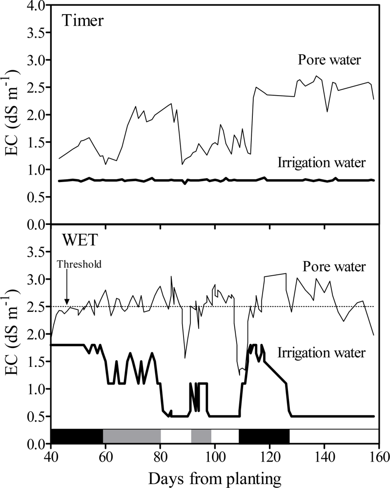 Changes in the salinity (EC) of the pore water (ECpw;, thin line) in the growing medium (peat-pumice mixture) and of the nutrient solution (thick line) fed to pot ornamentals grown at CESPEVI (Pistoia) in the spring-summer of 2008. Two irrigation regimes differing for scheduling method and the source of raw water were compared: : 1) timer control with nutrient solution (EC = 0.80 dS m−1) prepared using low-salinity groundwater (EC = 0.50 dS m−1); 2) WET scheduling and two sources of water (groundwater or saline water with EC = 1.50 dS m−1) to prepare the nutrient solution with a maximum EC of 1.80 dS m−1. In the latter, the nutrient solution EC was modulated by changing the rate of fertiliser addition and the water source in order to maintain the ECpw below 2.50 dS m−1. In the lower graph, the bars close to the abscissa indicate the source of irrigation water: saline water (black), groundwater (white) or mixed water (grey).