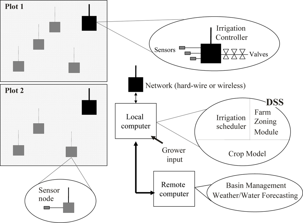 The combination of the new technology with data processing algorithms and models could be used to develop decision support system (DSS) with positive effects for a sustainable and efficient use of natural resources in agricultural production and enabling the decision maker to optimise production and profit through cost reduction. An example of DSS is the FLOW-AID system [60]. This system consists of an array of irrigation controllers distributed over the farm zones to be irrigated (Figure 5). The controllers are connected via a wireless communication link to a local computer, which retrieves regularly the data from RZS’ and weather station, and updates the irrigation scheduling programs running autonomously in the controllers. A DSS running on the local computer and partly on a remote computer (connected via the Internet) assists the grower in the optimization of the scheduler programs for the irrigation controllers on a long-term as well as on a short-term basis. For example, on a long term the DSS provides the grower with an optimized crop planting plan, a set of irrigation scheduling tasks and an estimate of annual water use per each irrigation plot. On a short term, and based on actual crop status, weather and, possibly the weather forecast, the DSS irrigation scheduler module predicts crop water demand and suggests the optimal scheduling strategy for each plot, including the source of water if different types of water are available (well, reservoir, recycled water, irrigation network etc.). The selected irrigation tasks, including parameter settings, are then downloaded into the remote irrigation controllers. The irrigation scheduler is run on a day-to-day basis (or hour-to hour, for instance in container cultivation) and, if needed, the individual controllers are reprogrammed. Each irrigation plot has an individual controller node, and local or remote sensors are added to it as needed by the application, either via hard-wire or a wireless link. A typical node has the tasks to monitor soil water status and other data (for instance, soil and air temperature), and to open and close multiple valves. Once programmed by the irrigation scheduler, the controller keeps on running its tasks autonomously, until it is re-programmed or stopped by the local computer. This makes the irrigation of individual plots fairly safe as it does not depend on real-time communication with a remote computer.
