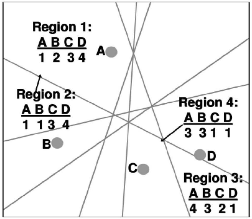 The sequence-based localization method is a novel and high-accuracy anchor-based WSN localization technique, which was recently proposed by Kiran and Bhaskar [9]. The 2D localization space is divided into distinct regions by the perpendicular bisectors of lines joining pairs of anchor nodes. Each region is uniquely identified by a rank sequence that represents the distance ranks of anchor nodes to that region. Figure 1 is an example of rank sequences for four anchor nodes [9].