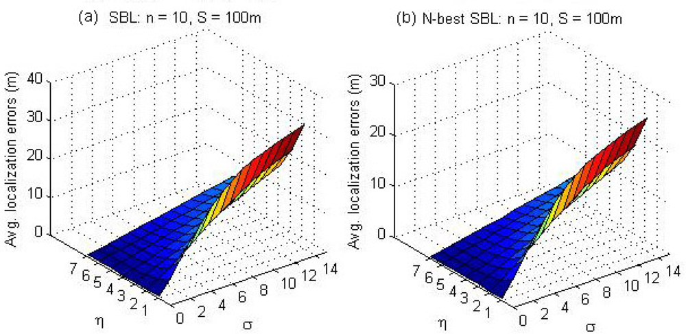 Figure 10 illustrates the average localization errors as a function of standard deviation σ and path loss exponent η for the SBL method (a) and the N-best SBL method (b), respectively. From the results reported in Figure 10, it is not difficult to see that the N-best SBL method is always superior to the SBL method in all cases. Especially, the superiority is very significant when η = 1 and σ = 14.