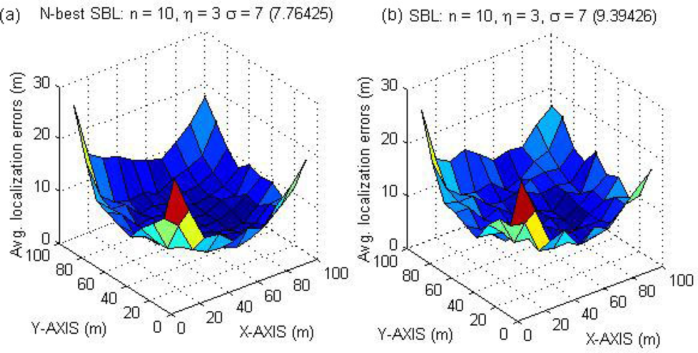 To verify the performance of the N-best SBL algorithm in a large scale WSN, we completed the simulations in MATLAB and present a comparative study with the original SBL algorithm. First, a 100 × 100 square meters localization space is defined, where n (n = 10) reference nodes are generated randomly and uniformly. The localization space is divided further into 100 grids of the same size, that is, each grid covers 10 × 10 square meters. Then, one virtual localization target node is generated randomly and uniformly in each grid. Thus, there are 100 virtual target nodes in total. Suppose that all nodes are in the radio range of each other. The lognormal shadowing simulation model (Equation 11) is utilized to generate corresponding RSS values. Finally, the localization for each target node is attained with 10 reference nodes, and the average localization errors are calculated, similar to Equation 14. The results in this section are averaged over 100 runs.