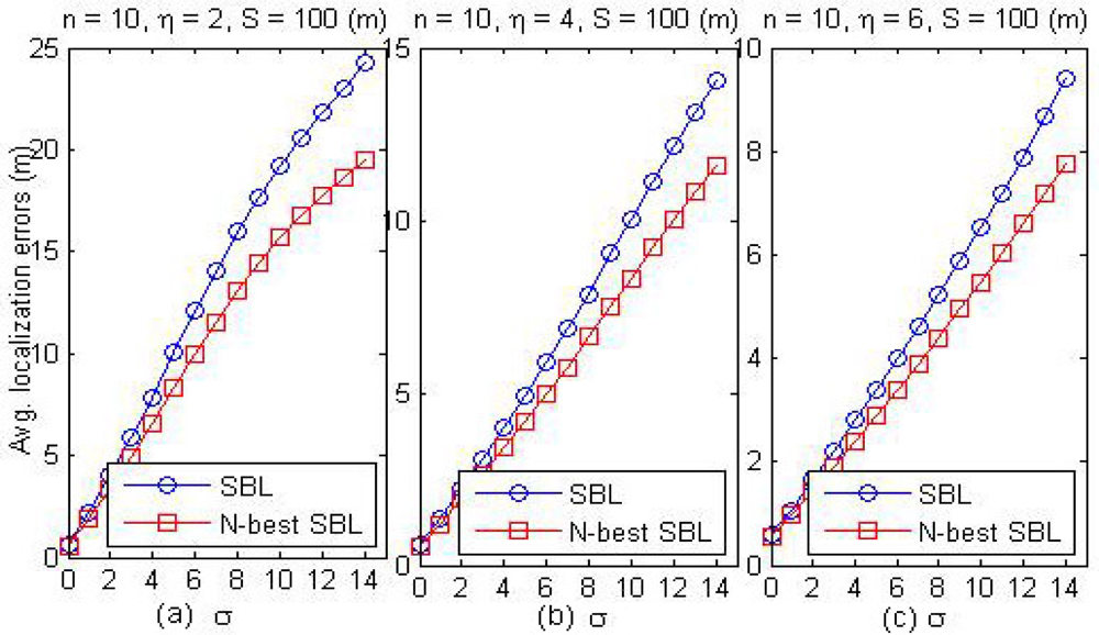 Figure 12 depicts the performance comparison of the SBL method and the N-best SBL method in terms of the average localization errors for η = 2 (a), η = 4 (b) and η = 6 (c), respectively. From the results in Figure 12, we can notice that for the wireless channel fading model by Equation 11, the average localization errors for the N-best SBL method are always lower than that of the SBL method when assuming standard deviation σ with various values. This indicates that the N-best SBL method has higher anti-noise ability.