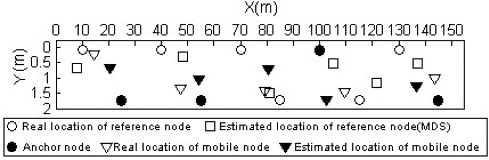 Figure 14 shows the performance comparison of the anchor-free localization method. The real location of reference nodes, the estimated location of reference nodes with non-metric MDS algorithm, the real location of the mobile node and the estimated location of the mobile node are illustrated. The anchor-free algorithm was executed in five positions by the mobile node. We calculated the average localization errors according to Equation 14, and got the final result: 0.6936 meters. It is an ideal result for the localization of mobile targets in underground mines.