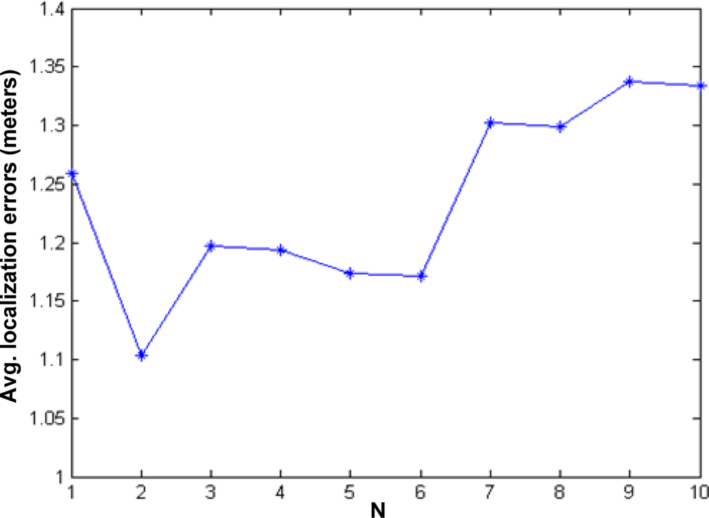 However, based on our detailed observation, we find that it is not optimal in terms of average localization errors if only one “nearest” sequence is searched in the sequence table. Figure 2 shows our experimental results with original outdoor MICA2 data in paper [9]. We select the top N “nearest” sequences instead of one sequence when searching the location sequence table. In this case, when N = 2, the minimal average localization error can be obtained.