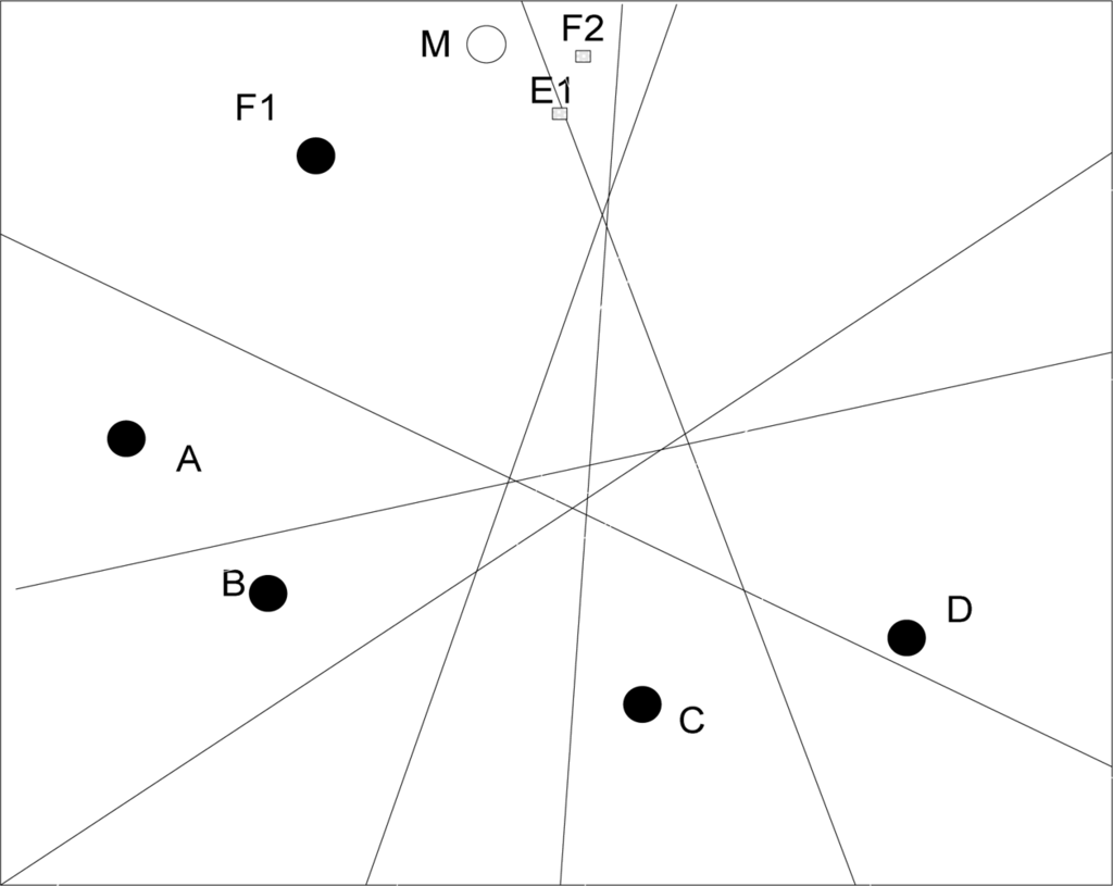 In addition, we also notice that the localization errors for nodes near the border of the region are possibly rather large. For example, in Figure 3, when mobile node M falls into region F1, its coordinate will be estimated as the centroid of F1 if no measurement errors exist. In fact, the real position of M is closer to the centroid of region E1, even F2.
