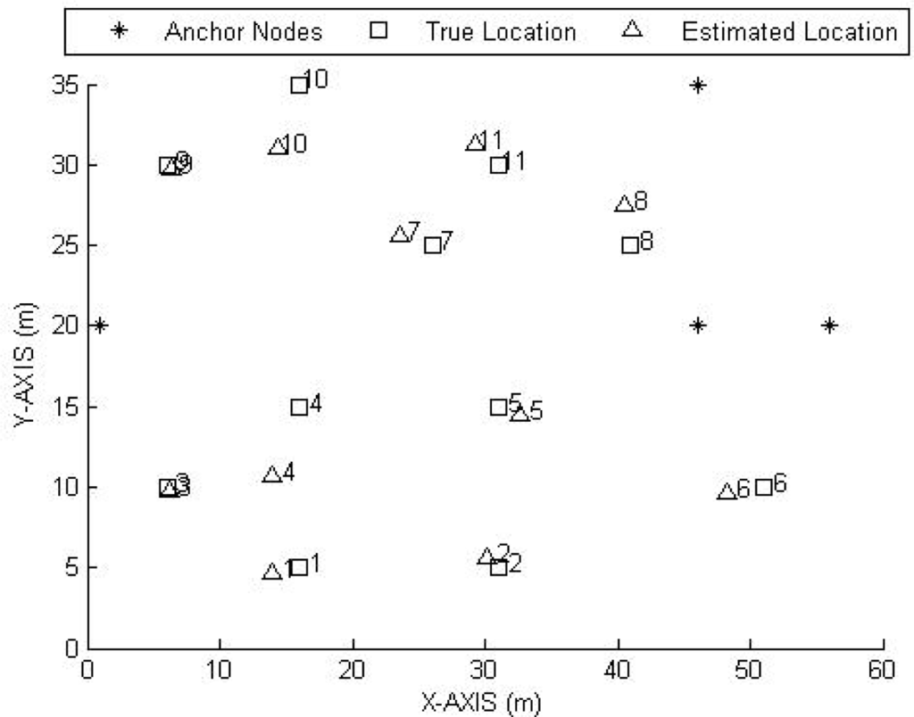 Figure 7 illustrates the difference between true locations and estimated locations of reference nodes in outdoor experiments for one run when m = 3.