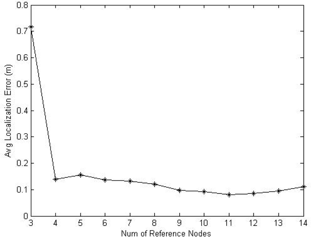 - Choose m reference nodes (m = 3, 4,…14) as anchor nodes randomly, run the non-metric MDS algorithm and estimate the location coordinates for all the nodes according to the RSS relationship matrix.