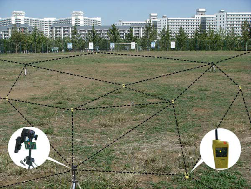 The outdoor experiments were realized in a vacant environment within an area of 60 m × 40 m, where 15 nodes of the Cicada series were randomly distributed. Cicada nodes are designed based on the CC2430 ZigBee chip with a radio frequency power amplifier. The point to point communication distance reaches to 200 m. The experimental process is as follows: